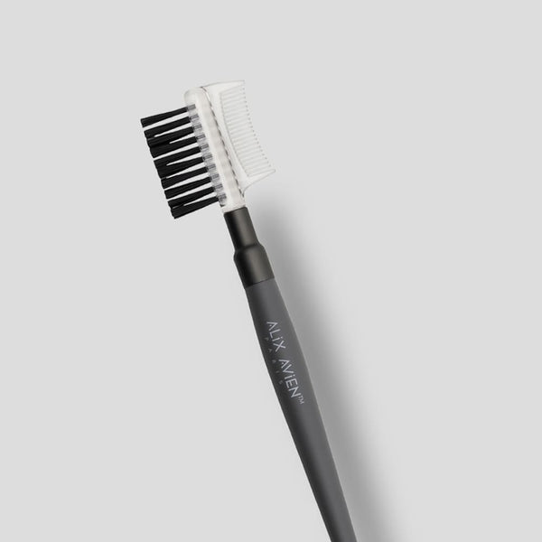 A double-sided brush for combing and grooming unruly eyebrows. The comb side can be used to remove excess mascara to prevent clumping.