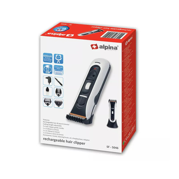 Trim your hair effortlessly with the ALPINA HAIR TRIMMER 5046. Its high-performance blades and ergonomic design provide precise and comfortable trimming. Say goodbye to uneven cuts and hello to a professional result every time. Trust the expertise of Alpina for your grooming needs.