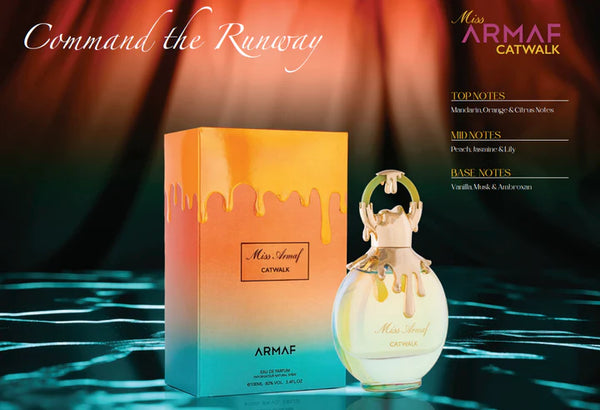 Strut with style on the olfactory Catwalk. Begin with Mandarin, Orange, and Citrus in the top notes, gracefully moving to a heart of Peach, Jasmine, and Lily. The fragrance concludes with Vanilla, Musk, and Ambroxan - a scent that captivates the runway and beyond