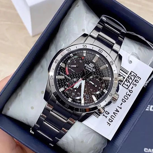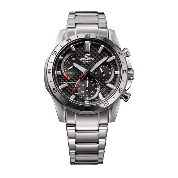 Case / bezel material: Stainless steel One-touch 3-fold Clasp Stainless Steel Band Carbon fiber dial Mineral Glass Screw Lock Back 100-meter water resistance Solar powered 1-second stopwatchMeasuring capacity: 9'59Measuring modes: Elapsed time, 1st-2nd place times Battery level indicator Date display