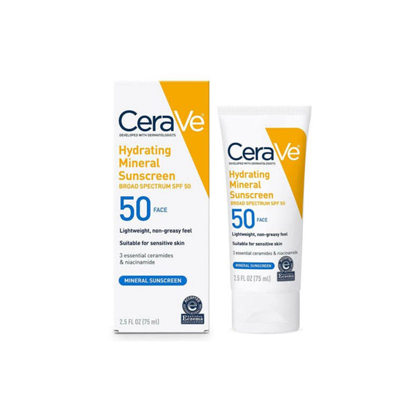 Protect your skin the gentle way with CeraVe Hydrating Mineral Sunscreen SPF 50 Face Lotion (75ml) — a 100% mineral, oil-free formula that shields your skin from harmful UVA and UVB rays without irritation.