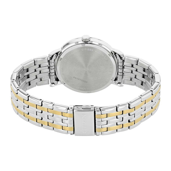 Mechanism: Analog(Quartz) Dial Color: Silver Dial Shape: Round Dial Size approx: 37mm Glass: Hardlex crystal Case Color: Silver Case width approx: 39mm Case Material: Stainless Steel Band Color: Silver and Gold Band Material: Stainless Steel Water Resistance: 50 Meter Warranty: 1 Year