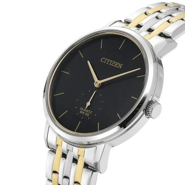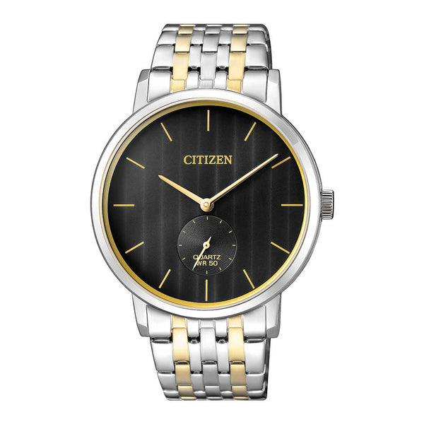 Mechanism: Analog(Quartz) Feature: Side Second Dial Color: Black Dial Shape: Round Dial Size approx: 37mm Glass: Hardlex crystal Case Color: Silver Case width approx: 39mm Case Material: Stainless Steel Band Color: Silver and Gold Tone Band Material: Stainless Steel Water Resistance: 50 Meter Warranty: 1 Year