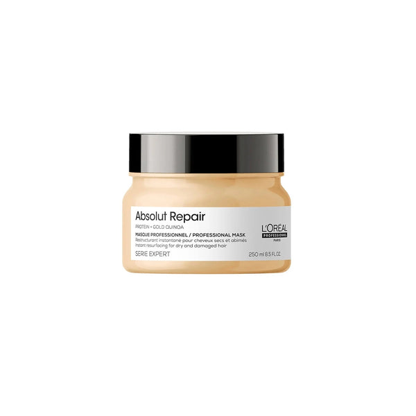 Experience intense hair repair and nourishment with LOREAL PRO ABSOLUTE REPAIR GOLD MASQUE 250ML LIGHT. This powerful masque, enriched with golden quinoa protein and wheat protein, restores damaged hair and adds strength and shine. Transform your locks with this professional-grade formula for visibly healthier and beautifully replenished hair.