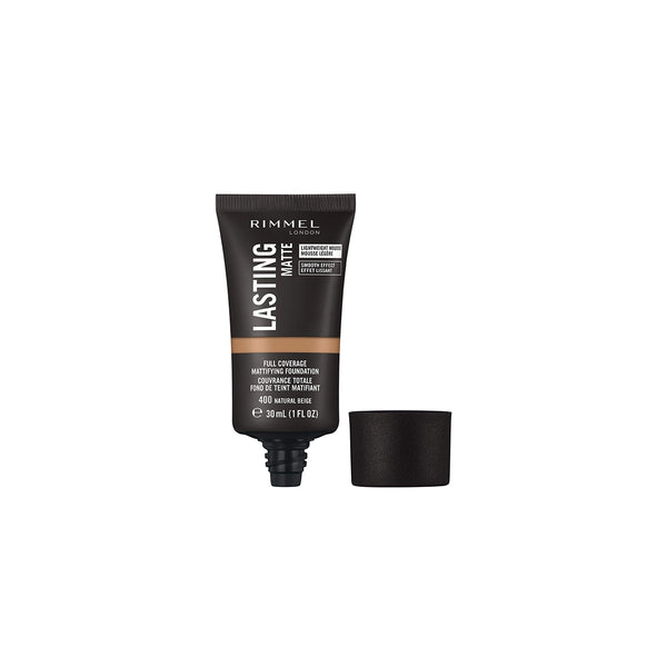 Rimmel's Lasting Matte Foundation in shade 400 Natural Bei provides all-day coverage with a lightweight, matte finish. The long-lasting formula is blendable and boasts 400% more pigment for a natural, flawless look. Perfect for those seeking a non-greasy, long-wearing foundation.
