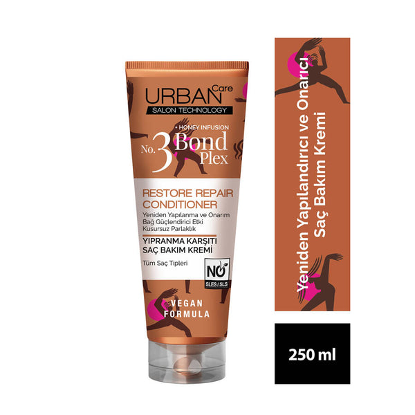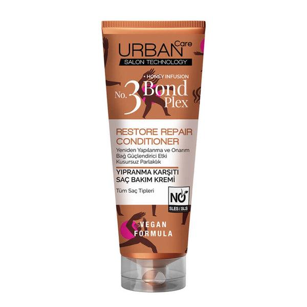 Urban Care No. 3 Bond Plex Hair Care Conditioner is developed to repair over-processed and excessively damaged hair and prevent further damage to hair strands. It hydrates the hair without weighing it down and helps repair damaged hair by penetrating into hair strands. It helps prevent frizzy and static hair. Supported with precious honey, its specially-developed formula hydrates the hair and makes it look soft and shiny. When broken hair bonds are repaired by the bond-strengthen- ing content of Bond Plex Series, they retain moisture and the nourishing effect of honey and help prevent thehaircolorfromfading. BondPlextechnologysupportsyourhair’sstrengthandresistancetodamage by high-temperature styling, chemical treatments such as dyeing, or environmental factors. It covers the haircuticleandsplitends,helpingprotectthehairbeforeheatstyling.