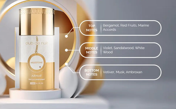 Armaf Club De Nuit Milestone Perfume Body Spray opens up with a top of bergamot, red fruits, and marine accord notes. At the heart of this captivating fragrance is a blend of violet, sandalwood, and white wood that is magnetic and energizing, emphasizing the hypnotic notes of musk and vetiver at the base.