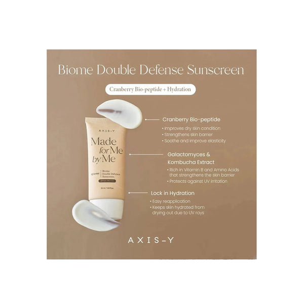 AXIS Y Biome Double Defense Sunscreen SPF50 is a 50ml formula engineered to deliver comprehensive sun protection while supporting skin's microbiome health. This expert-developed sunscreen combines broad-spectrum SPF50 protection with biome-friendly actives to shield skin from harmful UVA/UVB rays while maintaining beneficial skin bacteria balance. The lightweight lotion texture applies smoothly without disrupting skin's natural ecosystem, making it ideal for sensitive and microbiome-conscious skincare routines. The advanced double defense technology provides dual-layer protection: external UV shielding and internal microbiome support to enhance skin resilience and barrier function. The formula is water-resistant and designed to withstand daily activities while respecting skin's delicate microbial balance. Ideal for all skin types, particularly those with compromised barriers or sensitivity concerns, this sunscreen delivers innovative protection. Apply generously to exposed skin 15 minutes before sun exposure, reapply every two hours or after swimming. Experience superior sun protection with maintained microbiome health, enhanced skin resilience, and visibly protected, balanced skin.