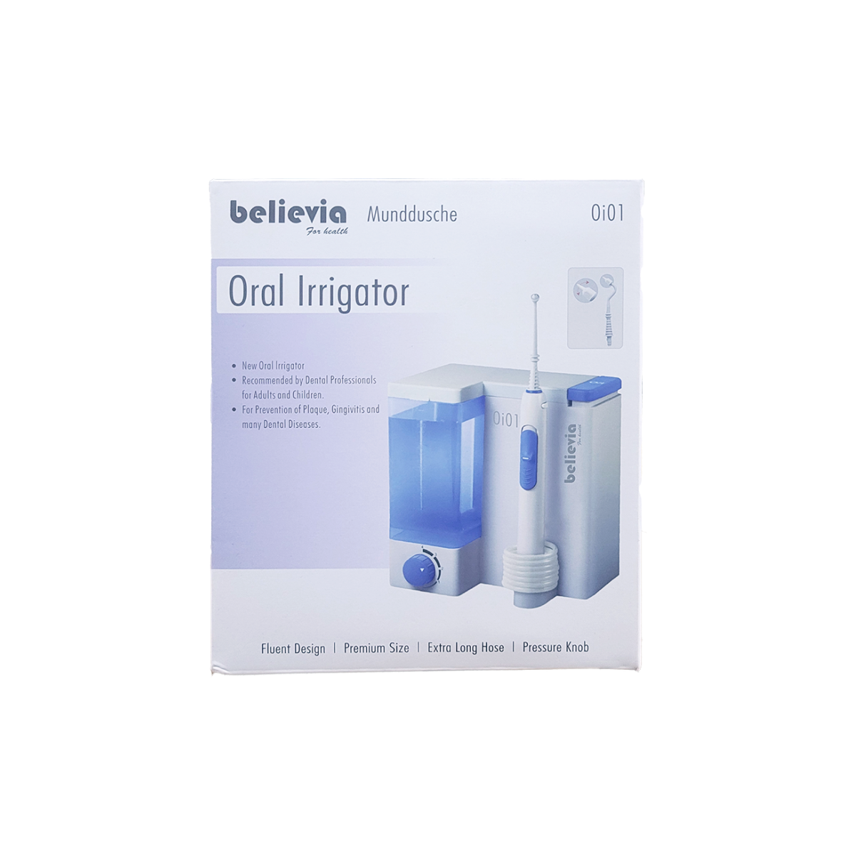 The Believia Oral Irrigator is a medical dental device for keeping the teeth clean and hygienic. It is a home dental care device which uses high-pressure stream of pulsating water to prevent the buildup of plaque, remove food debris, and prevent gum diseases like gingivitis.