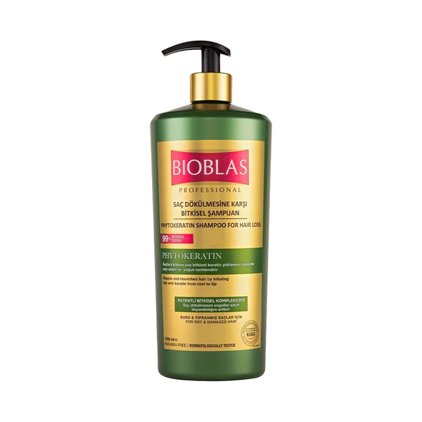 Bioblas Anti-Hair Loss Phytokeratin Shampoo 1000ml is a professional-grade shampoo developed with herbal keratin to deeply nourish, strengthen, and repair hair from root to tip. Its phytokeratin formula forms a protective film around each strand, shielding against chemical and physical damage caused by salon treatments and daily styling. This advanced formula helps repair split ends, thicken weakened strands, and improve hair resilience, ensuring your hair looks fuller, stronger, and healthier. Enriched with a herbal serum additive, it nourishes hair follicles, promoting a healthier scalp while reducing hair loss.