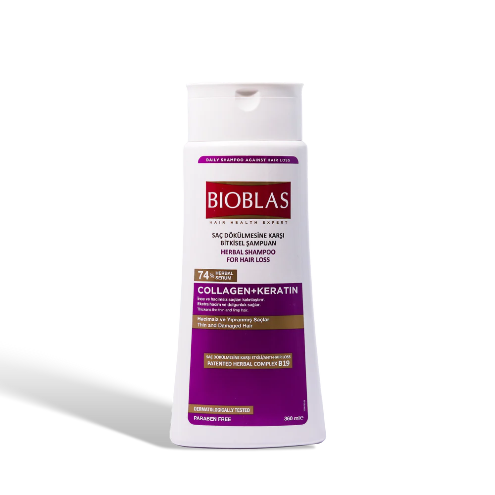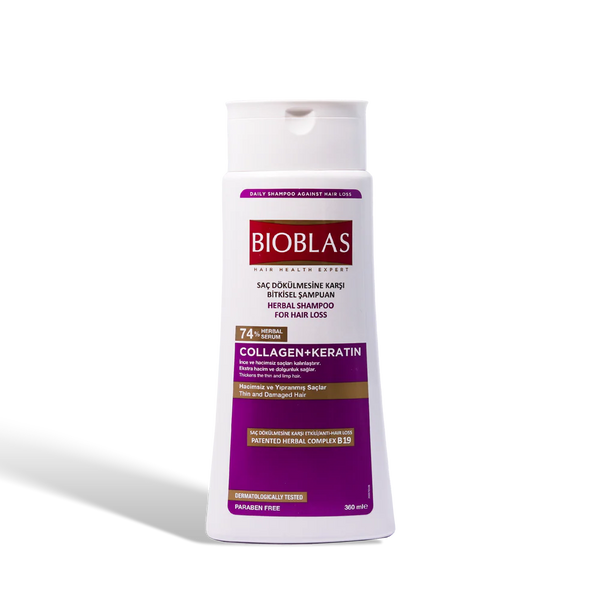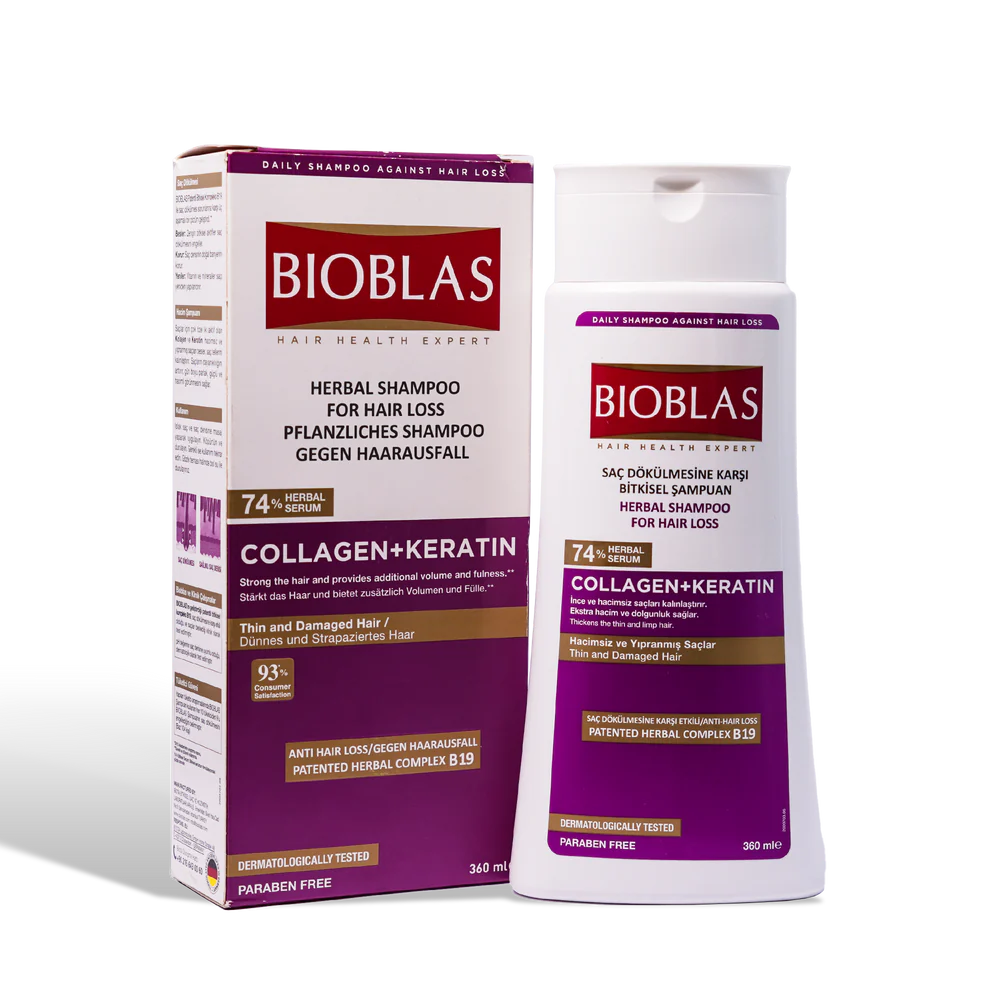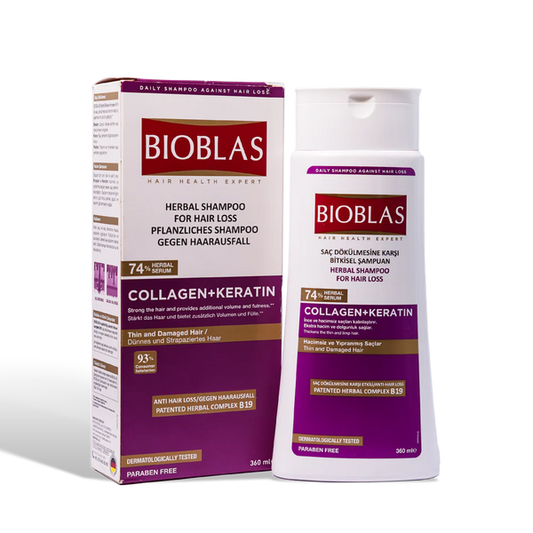 Bioblas Shampoo 360ml Collagen & Keratin 150+ is specially formulated for thin, limp, and weak hair that needs extra fullness and body. Infused with Collagen and Keratin, two premium actives known for their strengthening and nourishing properties, this shampoo delivers long-lasting volume, resilience, and shine. Backed by Bioblas’ Patented Herbal Complex B19, it has been clinically tested to prevent hair loss while nourishing follicles and improving scalp health. Its gentle, dermatologically tested pH-balanced formula makes it suitable for regular use. Free from parabens, phthalates, SLES, and sulfates, it ensures a safe and effective cleansing experience.