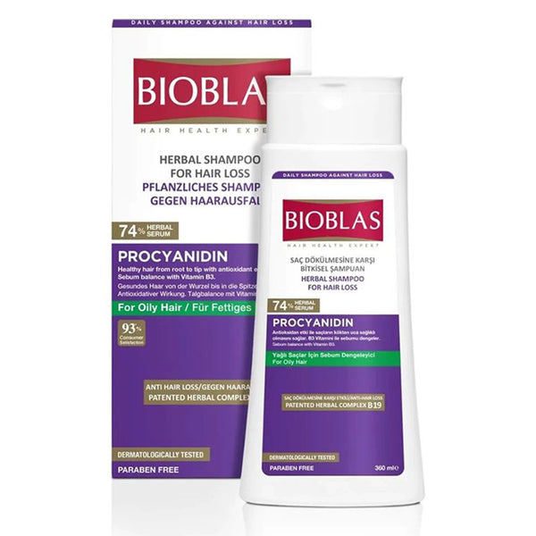 Transform your hair with Bioblas Shampoo 360ml Procyanidin 150, a dermatologist-tested formula designed to protect, strengthen, and revitalize weak or thinning hair. Enriched with Procyanidin 150, a powerful antioxidant derived from grape seeds, this shampoo shields the scalp and follicles from oxidative damage while encouraging stronger, healthier growth. The formula also contains Vitamin B3 (Niacinamide) to help balance sebum production, keeping oily scalps fresh and reducing excess buildup. Combined with the patented Herbal Complex B19, clinically...