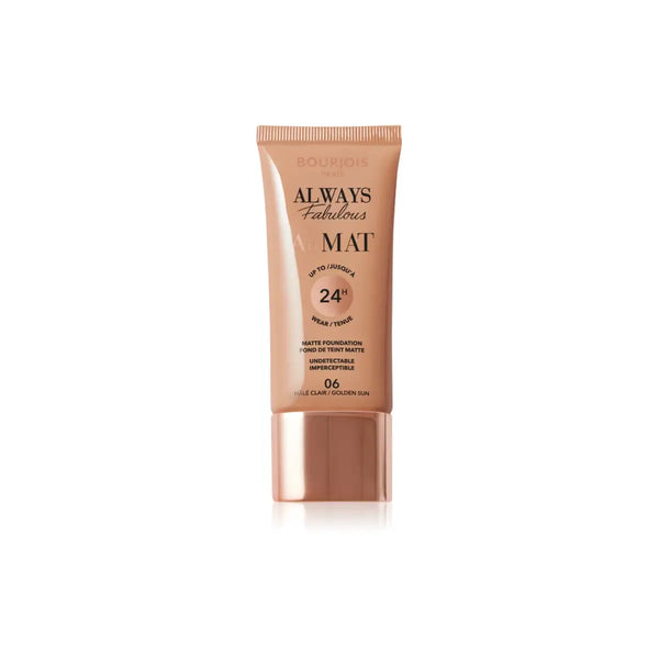 Smooth, lightweight formula with 24-hour wear creates a flawless, matte finish. Infused with Air Mat technology for a weightless feel and improved skin texture. Non-comedogenic for pore-friendly coverage. Achieve an always fabulous, airbrushed look with BOURJOIS ALWAYS FABULOUS AIR MAT FOUNDATION.