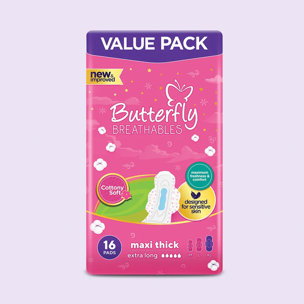 BUTTERFLY PADS BREATHABLES MAXI are made of thick, breathable cotton for maximum comfort and protection. With extra length, these pads provide reliable coverage for heavy flow days. Available in a convenient pack of 16 for long-lasting use. Stay comfortable and confident all day long.