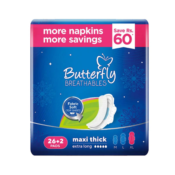 Experience maximum comfort and protection with BUTTERFLY PADS BREATHABLES MAXI THICK EXTRA LONG 26+2CS. The unique design provides breathability and extra thickness for added absorption. Perfect for long-lasting wear, these pads keep you feeling fresh and confident all day long.