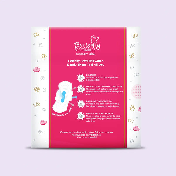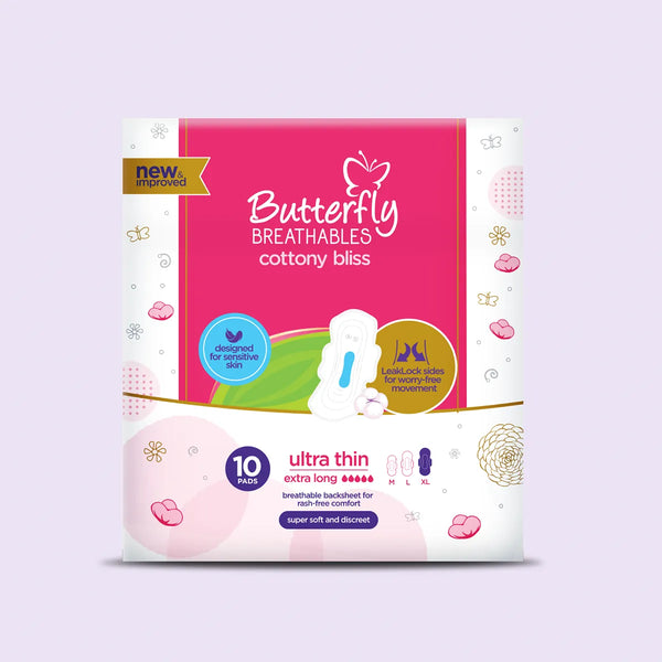 Introducing the BUTTERFLY PADS BREATHABLES, the ultra-thin and extra-long pads made with breathable cotton. Experience ultimate comfort and protection with 10CS included in each pack. Say goodbye to discomfort and hello to worry-free days.