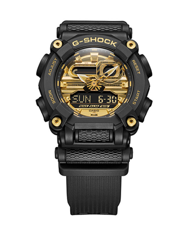 The Casio G-Shock GA-900AG-1ADR combines powerful design and reliable performance. Featuring a 35mm large case with raised hour markers, it creates a bold, three-dimensional look. Its three-dial analog-digital display offers a central analog dial flanked by two digital dials for superior functionality.
