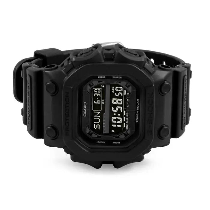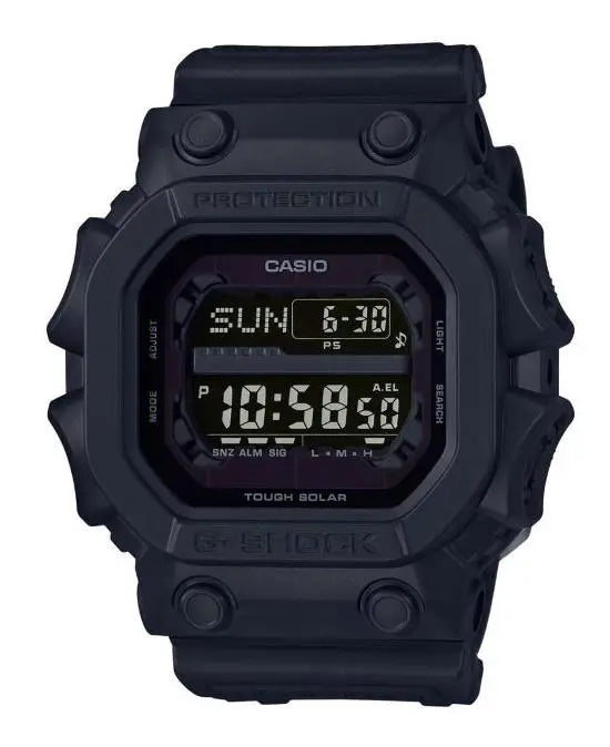The Casio G-Shock GX-56BB-1DR combines powerful design with ultimate durability. Its 35mm large case and three-dimensional dial with raised hour markers give it a bold, masculine look. The analog-digital three-dial face offers functionality and style, featuring a central analog dial flanked by digital displays.