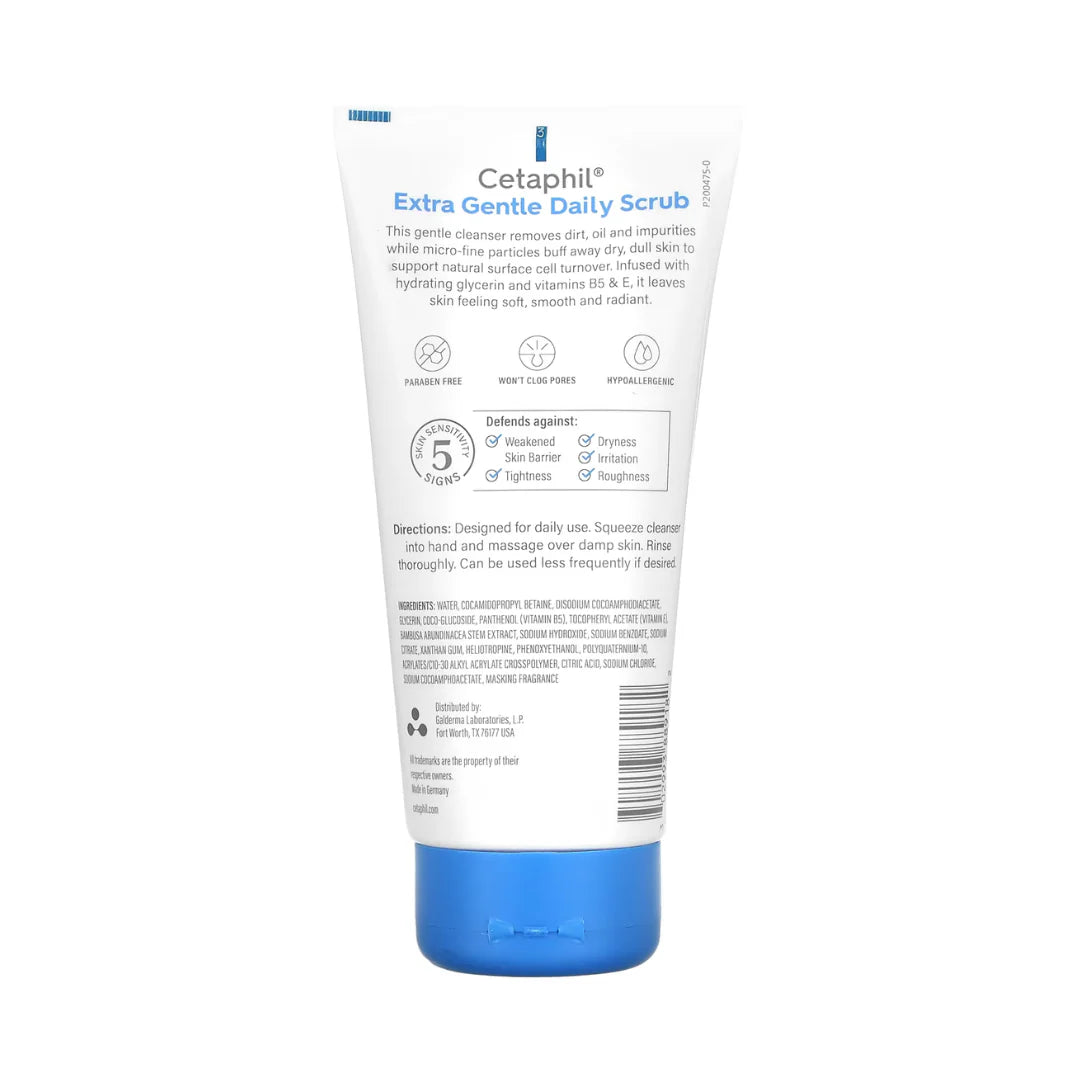 Reveal smoother, brighter skin with Cetaphil Extra Gentle Daily Scrub 178 ml — a gentle yet effective exfoliator designed for sensitive skin. With micro-fine granules that buff away dead skin and dullness, this formula cleanses while exfoliating to improve texture and reveal a radiant glow. Infused with skin-conditioners and a vitamin complex (including Vitamin B5 & E) it nourishes without over-drying, and is hypoallergenic, non-comedogenic, and dermatologist-tested for combination to oily and sensitive skin types