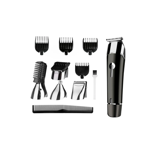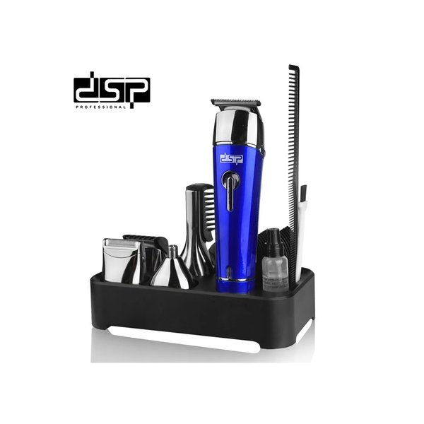 DSP Mens grooming kit includes T-shaped knife, U-shaped knife, nose hair trimmer, electric shaver, precision trimmer, cleaning brush, USB charging cable, limit comb(3-12mm / 1/2/3/4mm adjustable comb) and storage box.