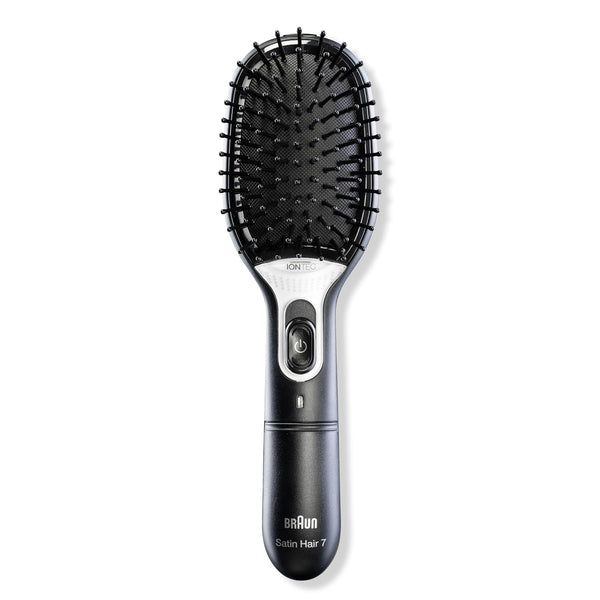The Braun IONTEC Brush is unique. While others have ions only buried in their material, the IONTEC Brush actively produces them in millions and pushes them out through the little green jet. You can even hear it work with a quiet hiss. All those ions infuse your hair and beat static and frizz for instantly visible shine. And they help transport the moisture of the surrounding air back into the hair. Which is a very healthy thing to do.