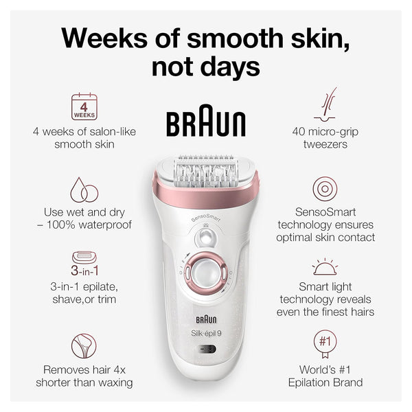The Braun Silk-épil 9 9/700 has an extra wide head offering you a quicker epilation than with any other electric epilator, so that your Braun silk-épil adapts to the contours of your skin.