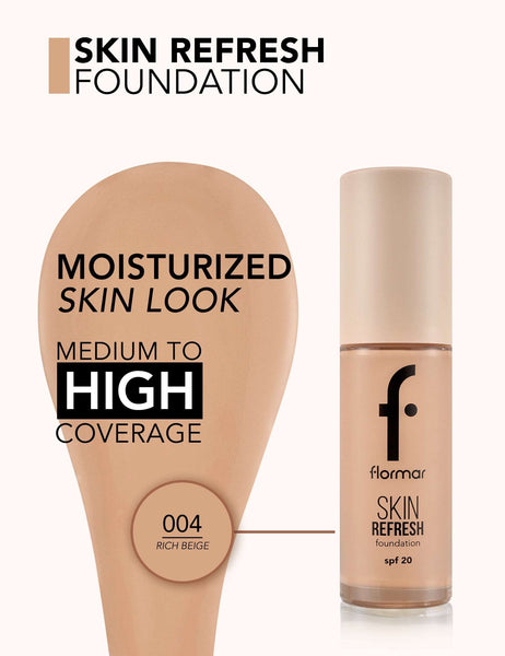 Flormar Skin Refresh SPF 20 Foundation is a thin and liquid textured, comfortable and long-lasting foundation with a natural finish, warm undertone, moisturizing effect, high color pigments and plant-derived extracts, and an illuminating effect suitable for all skin types.