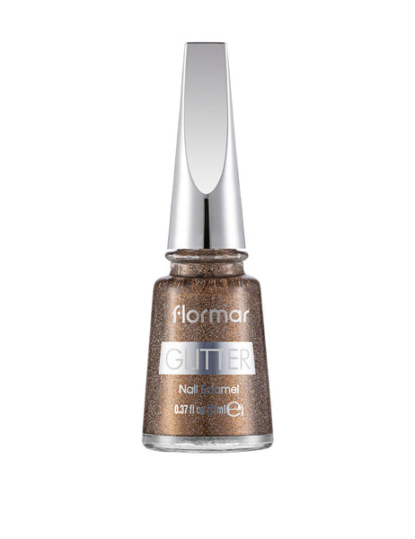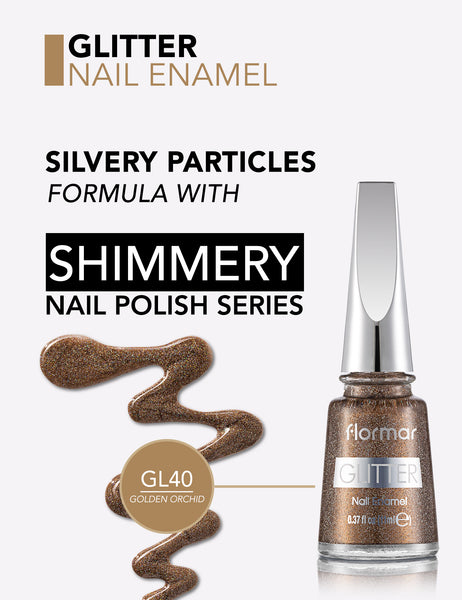 Shimmering nails. Specially designed Glitter Nail Enamel contains nacres in different sizes and textures. Thus, it provides intense and colorful glitter. Long-lasting Flormar nail polish will provide your hands with a brand new charm. When you apply a nail primer underneath, you can achieve even better results. HOW TO APPLY: Apply one coat to clean, dry nails and over a base coat. Allow drying. Apply a second coat wait 2 minutes and apply the Top...