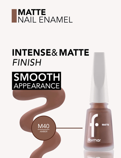Matte look on your nails. Matte Nail Enamel’s special formula creates a velvety effect on your nails. Providing glamorous results in manicure, Flormar nail polish will leave a fascinating effect on your hands. HOW TO APPLY: Apply one coat to clean, dry nails and over a base coat. Allow drying. Apply a second coat wait 2 minutes and apply the Top Coat.