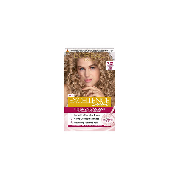This LOREAL CREAM EXCELLENCE COLOR 7.31 offers a professional solution for achieving a vibrant and natural-looking hair color. With its advanced formula, it covers 100% of grays and provides long-lasting color. Perfect for those seeking a high-quality, scientifically proven hair color experience. Get a beautiful, shine, and intense color with LOREAL CREAM EXCELLENCE COLOR 7.31.