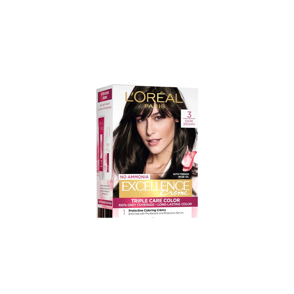 Experience beautiful hair color with LOREAL EXCELLENCE COLOR 03. This professional-grade formula delivers 100% gray coverage with a natural, radiant shine. With a range of rich shades to choose from, achieve salon-worthy results and nourished hair at home.