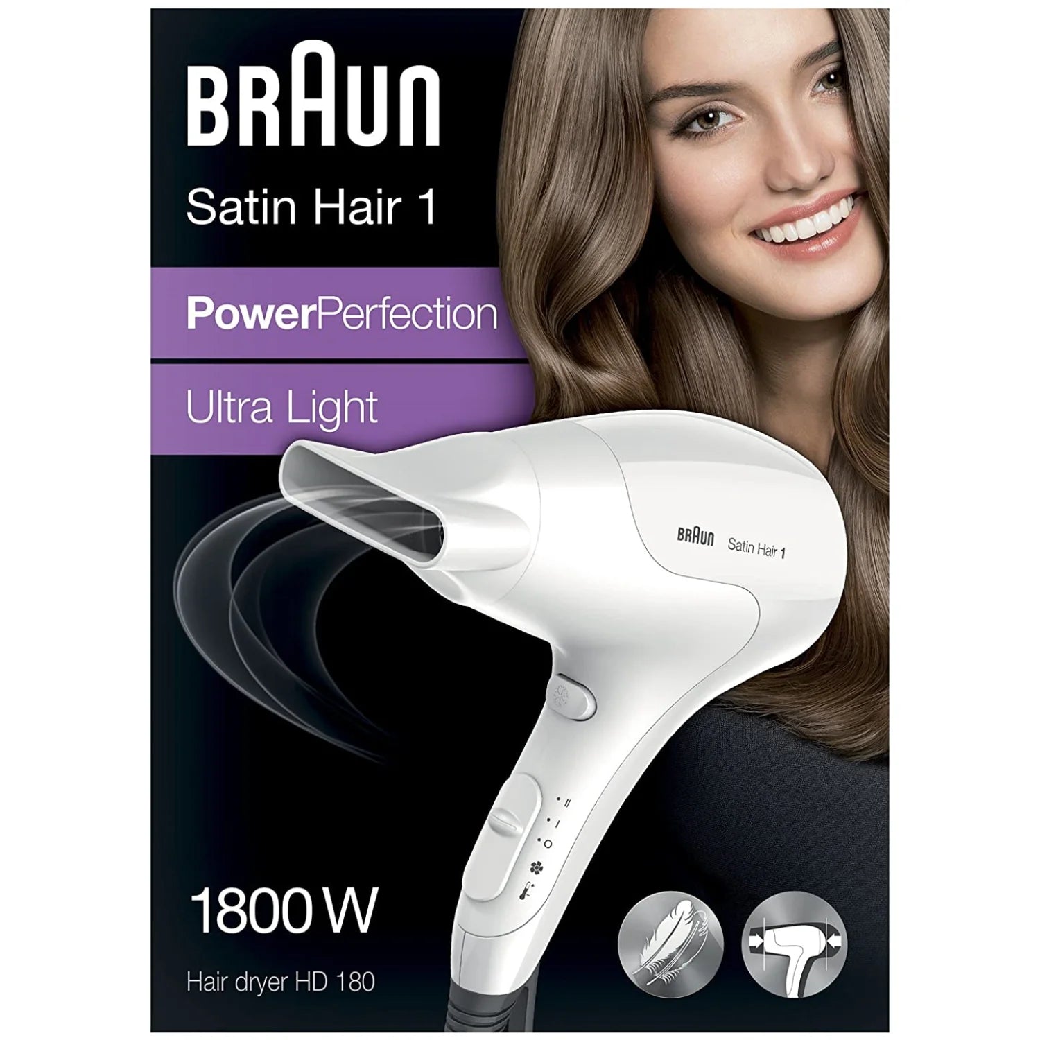 Braun hair dryers are  designed to be lightweight, compact, and powerful. Braun Satin Hair Power Perfection dryer:  This 2500 W dryer is lightweight and compact, making it easy to use in all directions. Satin Hair Style & Go dryer:  This foldable, travel dryer is compact and lightweight, and is designed to be powerful enough to dry and style hair anywhere. Braun Satin Hair1 Ultra Light 1800W Hair Dryer, HD-180.