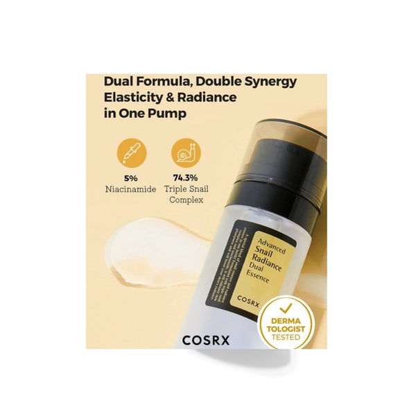 COSRX Advanced Snail 92 Mucin Dual Essence is a powerful rejuvenating formula designed to hydrate, nourish, and strengthen your skin barrier. Infused with 92% snail mucin extract, this essence delivers deep moisture, improves elasticity, and supports skin repair. Its dual-action system boosts radiance, promotes smoother texture, and helps reduce signs of aging. Suitable for all skin types, especially dull, dehydrated, and tired skin, it absorbs quickly without feeling sticky. Achieve firmer, plumper, and healthier-looking skin with consistent use of this advanced snail-based skincare treatment.