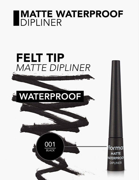 Matte Waterproof Dipliner Black Matte Waterproof Dipliner is the secret to longlasting eye makeup! This water resistant Flormar dipliner offers a matte finish throughout the day. Thanks to its ease of application,this quickdrying,smudgefree eyeliner allows you to create thin and flawless lines. Promising a lasting style all day long with its water-resistant formula, Flormar Matte Waterproof Dipliner creates breathtaking dramatic lines even in one application with its matte finish and intensely pigmented structure.