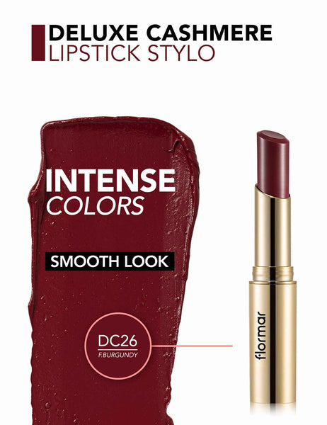 Deluxe Cashmere Lipstick Stylo The key to a smooth look on your lips is Deluxe Cashmere Lipstick Stylo. With its 10 different enriched color options it goes with the flow; and with its semimatte effect it can be used for natural and dashing makeups alike. Further more, it moisturizes and protects the lips with its formula, rich in special antioxidants.