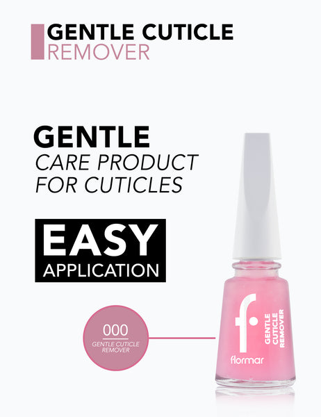 Gentle Cuticle Remover Flormar Gentle Cuticle Remover is a nail care product that allows you to easily complete your manicure at home. Quickly apply Cuticle Remover care product on your cuticles with its easy application brush and easily clean your softened cuticles. You can use the colorless Gentle Cuticle Remover once a week in your manicure.