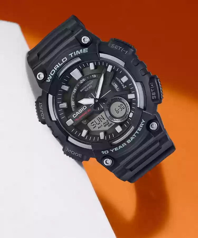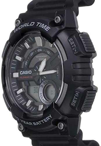 Stay on time and organized with the Casio AEQ-110W-1AVDF Youth-Combination Analog-Digital Black Dial Men's Watch. This timepiece features a 10-year battery life, world time function, and 100-meter water resistance for durability. The tele memo 30 allows you to store up to 30 sets of data, while the 1/100-second stopwatch and alarms help keep you on schedule. Perfect for everyday wear and adventure seekers alike.
