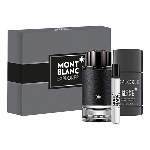 This Mont Blanc Gift Set Includes: 3.3 Oz Eau De Parfum Spray 3.3 Oz After Shave Balm 0.25 Oz Eau De Parfum Travel Spray Introducing Explorer, the new fragrance from Montblanc. This unconventional woody aromatic leather Eau De Parfum reveals a fresh green Italian bergamot.