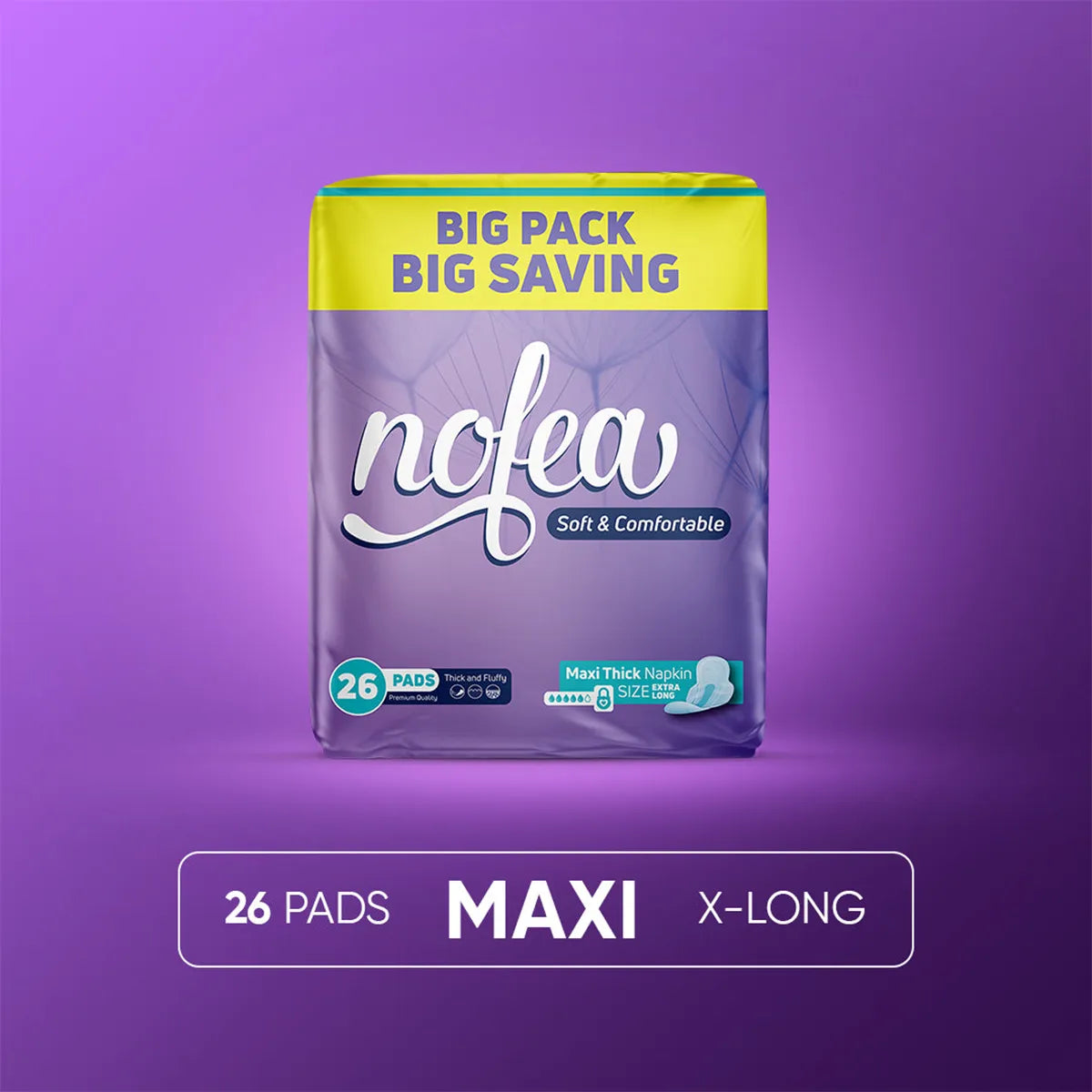 NOFEA MAXI THICK EXTRA LONG 26CS offers maximum absorption and protection for your comfort and confidence. Made with extra thick material, these 26 count pads provide extended coverage for long-lasting freshness. Experience the difference with NOFEA.