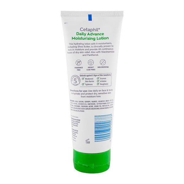 Experience long-lasting hydration with Cetaphil Daily Advance Moisturizing Lotion 227g, a dermatologist-tested formula specially designed for dry and sensitive skin. Enriched with niacinamide (vitamin B3), panthenol (pro-vitamin B5), and hydrating glycerin, this nourishing lotion instantly soothes and replenishes moisture for up to 48 hours. The addition of shea butter helps restore the skin’s natural barrier, leaving it soft, smooth, and healthy-looking. Suitable for daily use on the face and body, it absorbs quickly without leaving a greasy residue.