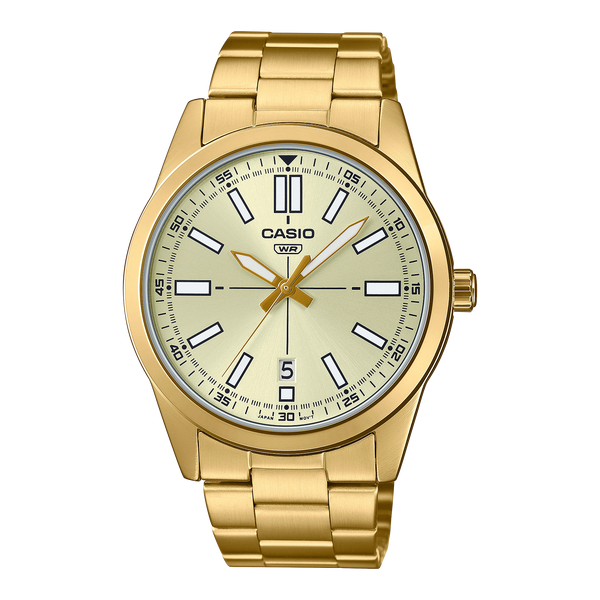 Stainless Steel Band Triple-fold Clasp Mineral Glass Gold ion plated band Gold ion plated case Water Resistant Date display Regular timekeeping Analog: 3 hands (hour, minute, second) Accuracy: ±20 seconds per month