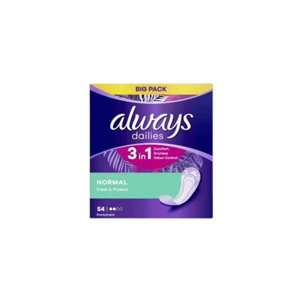 Introducing ALWAYS DAILIES 3IN1 54 PANTYLINERS in NORMAL FRESH & PROTECT. Stay fresh and confident all day with triple protection against leaks, odors, and moisture. Experience up to 100% protection with every use. Perfect for your daily routine.