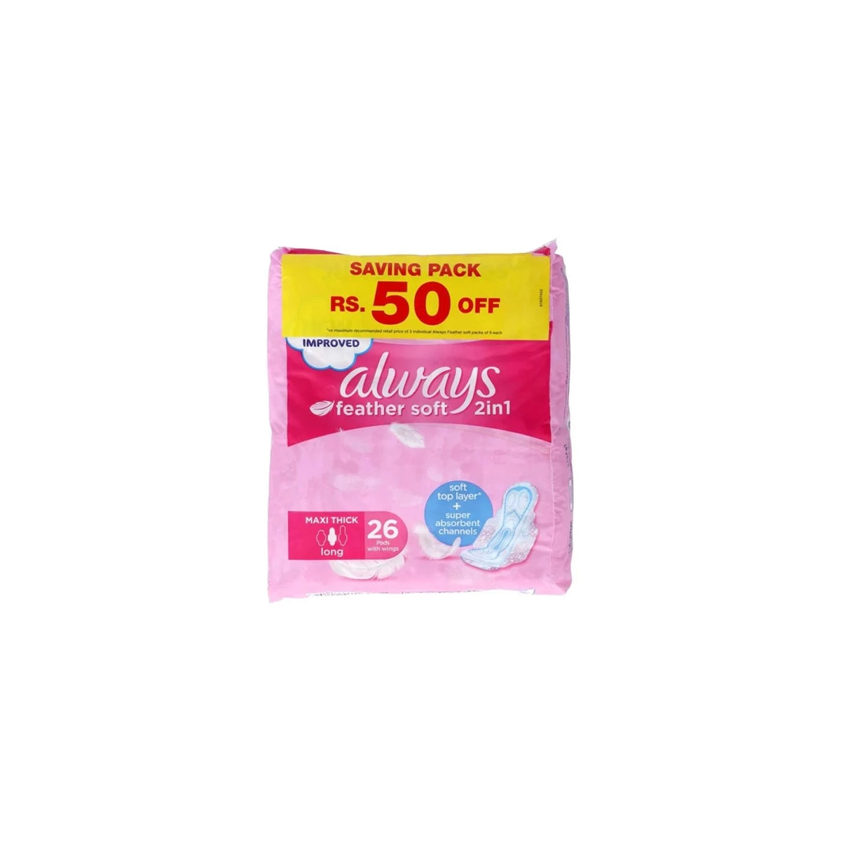 Introducing ALWAYS PAK MAXI THICK FEATHER SOFT LONG 26PCS, the perfect solution for heavy flow days. With its 26 pieces, feather soft material and extra length, this pack ensures maximum comfort and protection. Experience the confidence that comes with ALWAYS.
