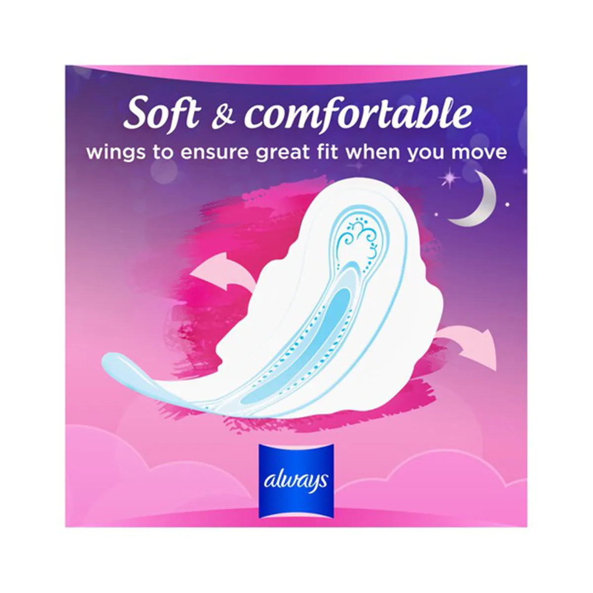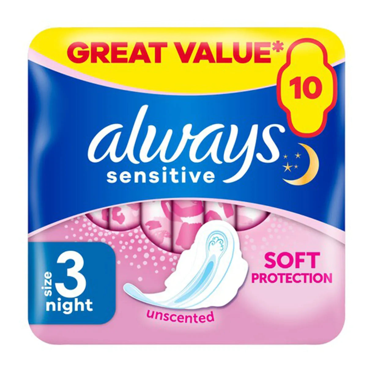Experience ultimate comfort and protection with ALWAYS SENSITIVE WINGS NIGHT 10S. Designed for night use, these pads have wings for secure fit and are perfect for sensitive skin. Get up to 100% leak-free protection and enjoy a peaceful night's sleep.