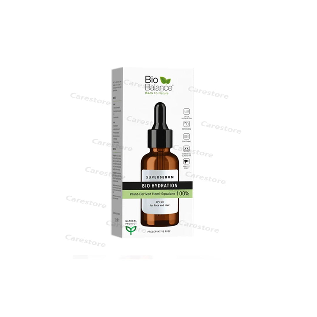 BIO BALANCE Super Serum Bio Hydration (30ML) is a deeply nourishing, natural serum that hydrates, repairs, and softens skin while leaving a light, non-greasy finish. Formulated with 100% plant-derived Hemi-Squalene (ECOCERT approved), this preservative-free and perfume-free serum works to restore skin barrier function, prevent moisture loss, and enhance skin softness. Its lightweight texture makes it suitable for both skin and hair care, providing natural hydration without heaviness.