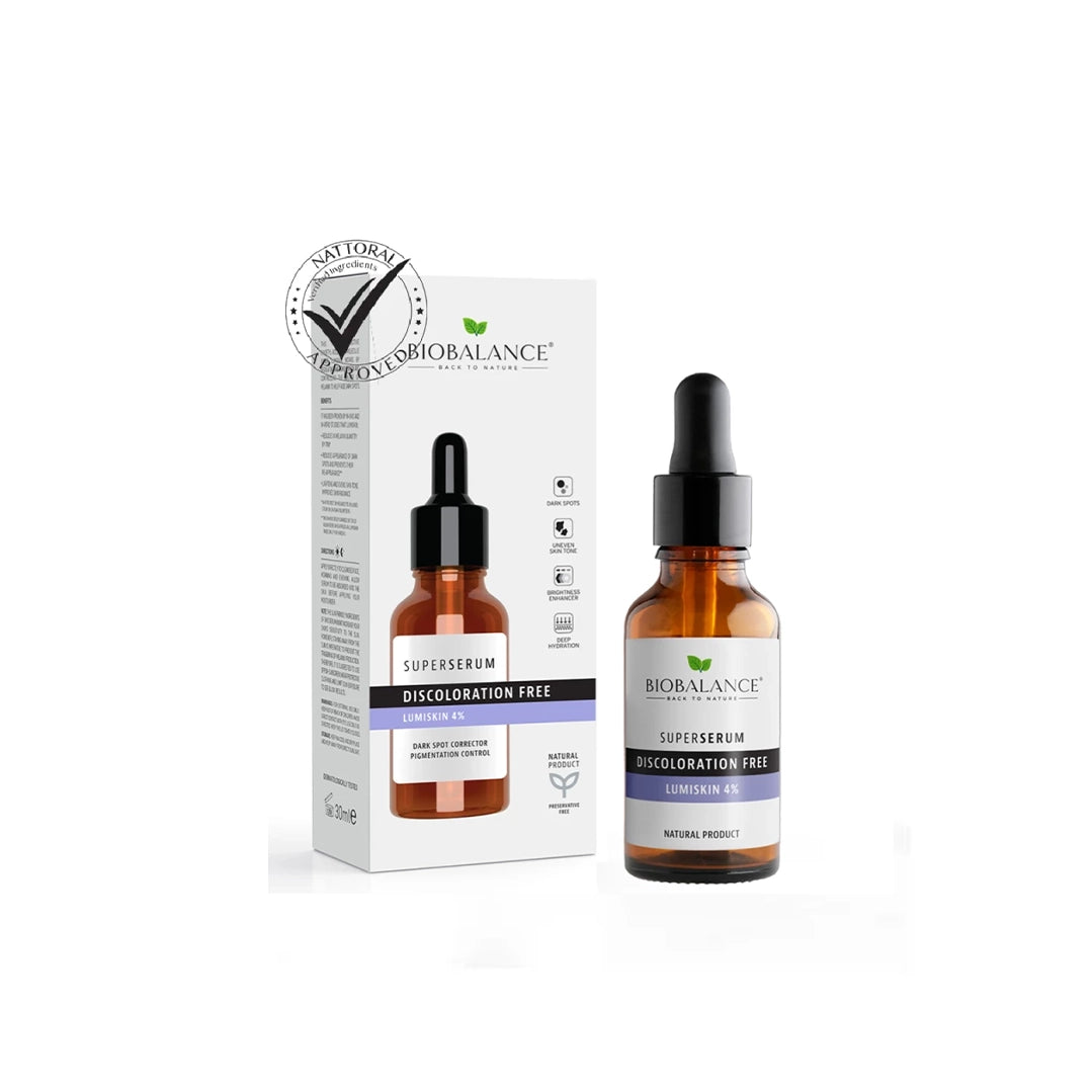 BIO BALANCE Super Serum Discoloration Free (30ML) is a targeted pigmentation treatment designed to visibly reduce dark spots, melasma, and uneven skin tone. Infused with the powerful Diacetyl Boldine molecule in Lumi Skin Complex, this serum neutralizes pigmentation activity and controls melanin production to prevent new discoloration. With consistent use, it helps achieve a clearer, brighter, and more radiant complexion, making it ideal for those struggling with stubborn pigmentation.