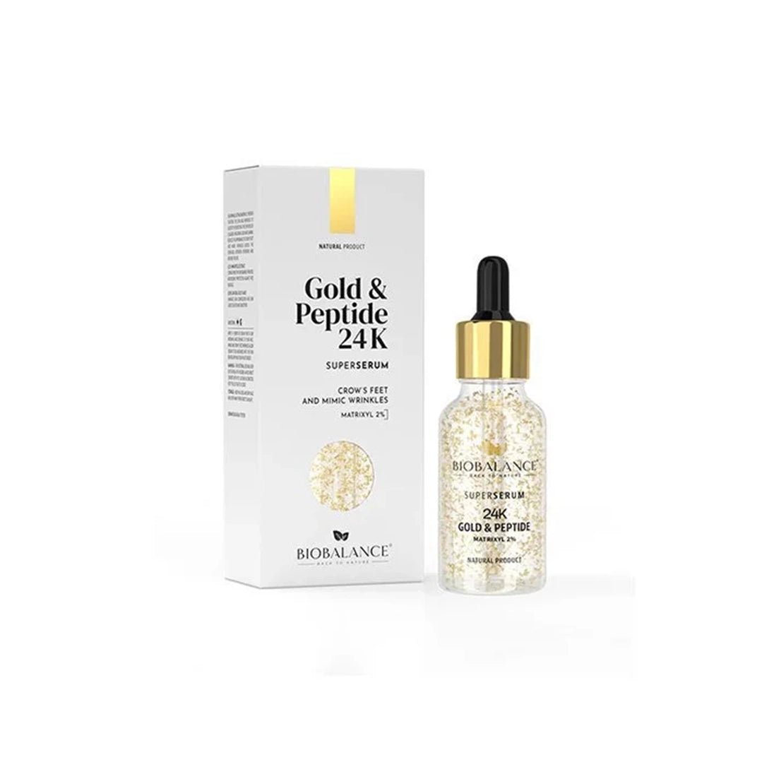 IO BALANCE Super Serum Gold & Peptide 24K (30ML) is a luxury anti-aging serum infused with 24K real gold flakes and Palmitoyl Tripeptide-38. This advanced formula brightens dull skin, restores radiance, and delivers a visible lifting effect. The gold-infused serum improves skin tone instantly, while powerful peptides stimulate collagen, hyaluronic acid, and laminin synthesis to reduce fine lines and wrinkles over time.