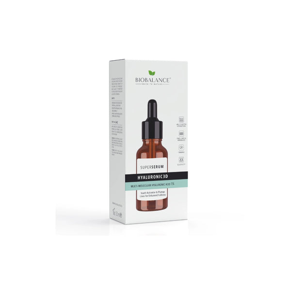 BIO BALANCE Super Serum Hyaluronic 3D (30ML) delivers intense, multi-layer hydration with its triple molecular hyaluronic acid complex. Formulated to penetrate deep into the skin, this serum restores lost moisture, boosts plumpness, and helps reduce visible signs of aging.