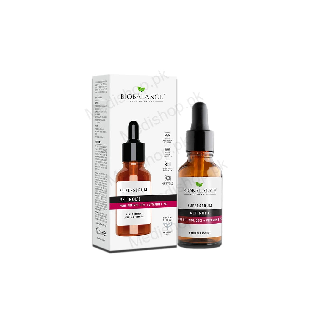 Bio Balance Retinol Super Serum is a concentrated super serum with Retinol and Vitamin E that revitalizes skin overnight and improves the appearance of visible signs of aging and pores. Directions: Use once a day, only at night. Apply 2-3 drops of the serum to clean dry skin, avoiding the eye area.