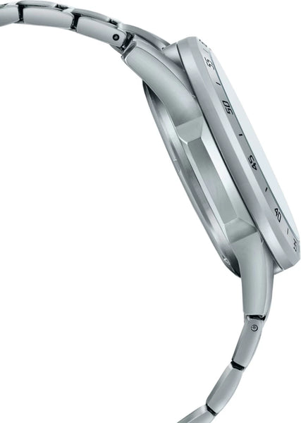 Case / bezel material: Stainless steel One-touch 3-fold Clasp Stainless Steel Band Carbon fiber dial Mineral Glass Screw Lock Back 100-meter water resistance Solar powered 1-second stopwatchMeasuring capacity: 9'59Measuring modes: Elapsed time, 1st-2nd place times Battery level indicator Date display